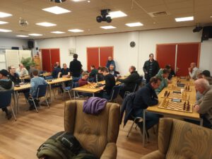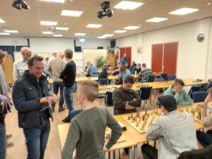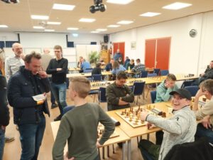 Okay, er deden vier jeugdleden mee, maar dan nog waren we met velen, verdeeld over rapid (16) en blitz (14). Maar er waren ook oud-leden, leden die aanhang mee brachten (Marko Burger nam zoon Frederiko mee en Siebe Schouten nam vader Matthijs mee), mensen die De Zwarte Dame volgen op de site, die dan weer een kennis meenam, die een zoon meenam en weer een kennis van die zoon (zo was het tenminste, geloof ik).