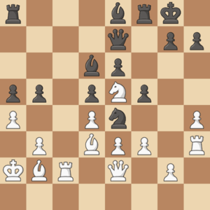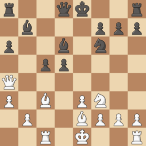 Zwart is aan zet (logisch, want staat schaak). Herman wilde niet 14….Dd7 spelen, waarschijnlijk omdat (na 15. Dxd7+, Kxd7 15. Lxf6, gxf6) hij een zwakke dubbelpion op de f-lijn heeft. Dat klopt, maar zwart heeft ook een open g-lijn. Maar zwart hoeft niet met de koning op d7 terug te slaan; ook 15….Pxd7 kan, want na 16. Lxg7, Tg8 verliest zwart geen pion (want op de volgende zet slaat de toren op g2).